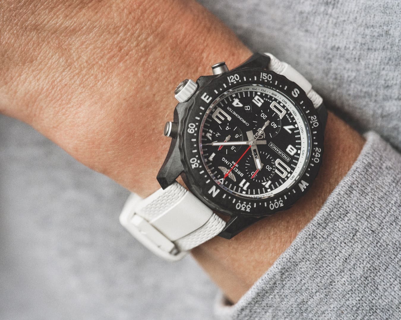 Als Athleisure-Chronograph konzipiert, überzeugt die Endurance Pro vor allem durch ihre Leichtigkeit und ihre angenehme Präsenz am Handgelenk. Das Gehäuse aus Breitlight® ist spürbar leichter als klassische Materialien und zugleich widerstandsfähig gegenüber den Anforderungen eines aktiven Alltags. Seine feine, leicht strukturierte Oberfläche verleiht der Uhr eine eigenständige, moderne Anmutung.