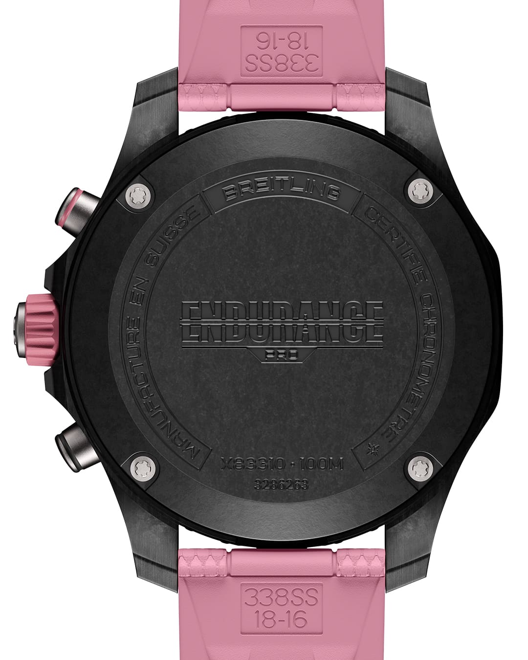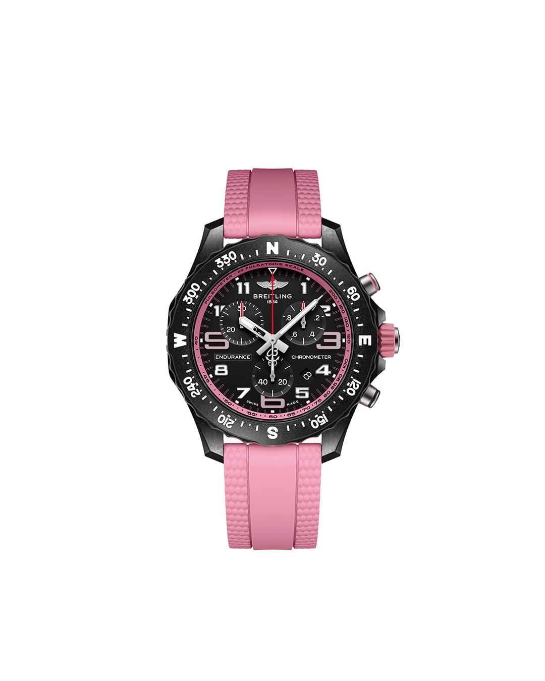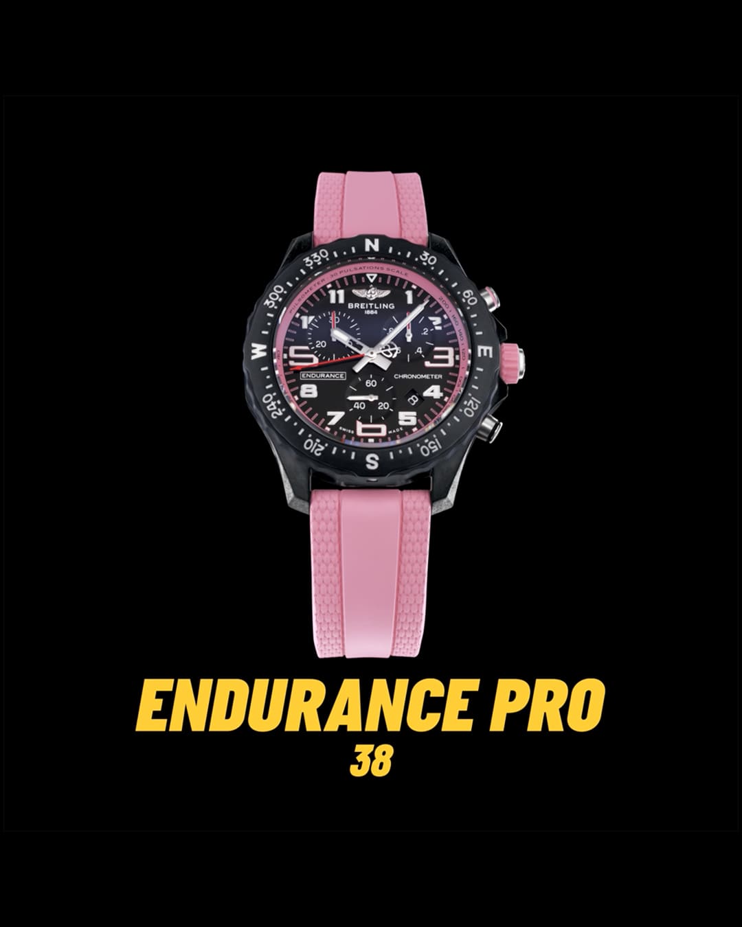 Mit der Endurance Pro 38 bietet Breitling einen sportlichen Chronographen, der nicht nur durch Leichtigkeit und Funktionalität überzeugt, sondern auch durch bewusste Farbgebung: Die pinke Ausführung der Uhr steht in diesem Monat ganz im Zeichen des Brustkrebs-Bewusstseins und verbindet sportliche Höchstleistung mit femininer Ausdrucksstärke.