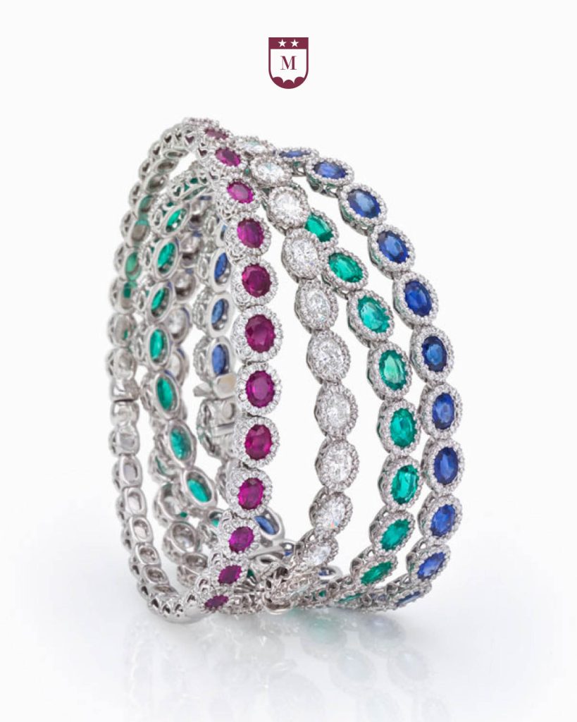 Diese Armbänder aus Weissgold setzen die berühmten Edelsteine Rubin, Smaragd und Saphir sowie Diamanten vollendet in Szene. Beeindruckender Schmuck, gemacht für den Frühling mit seinen leuchtenden Farben.