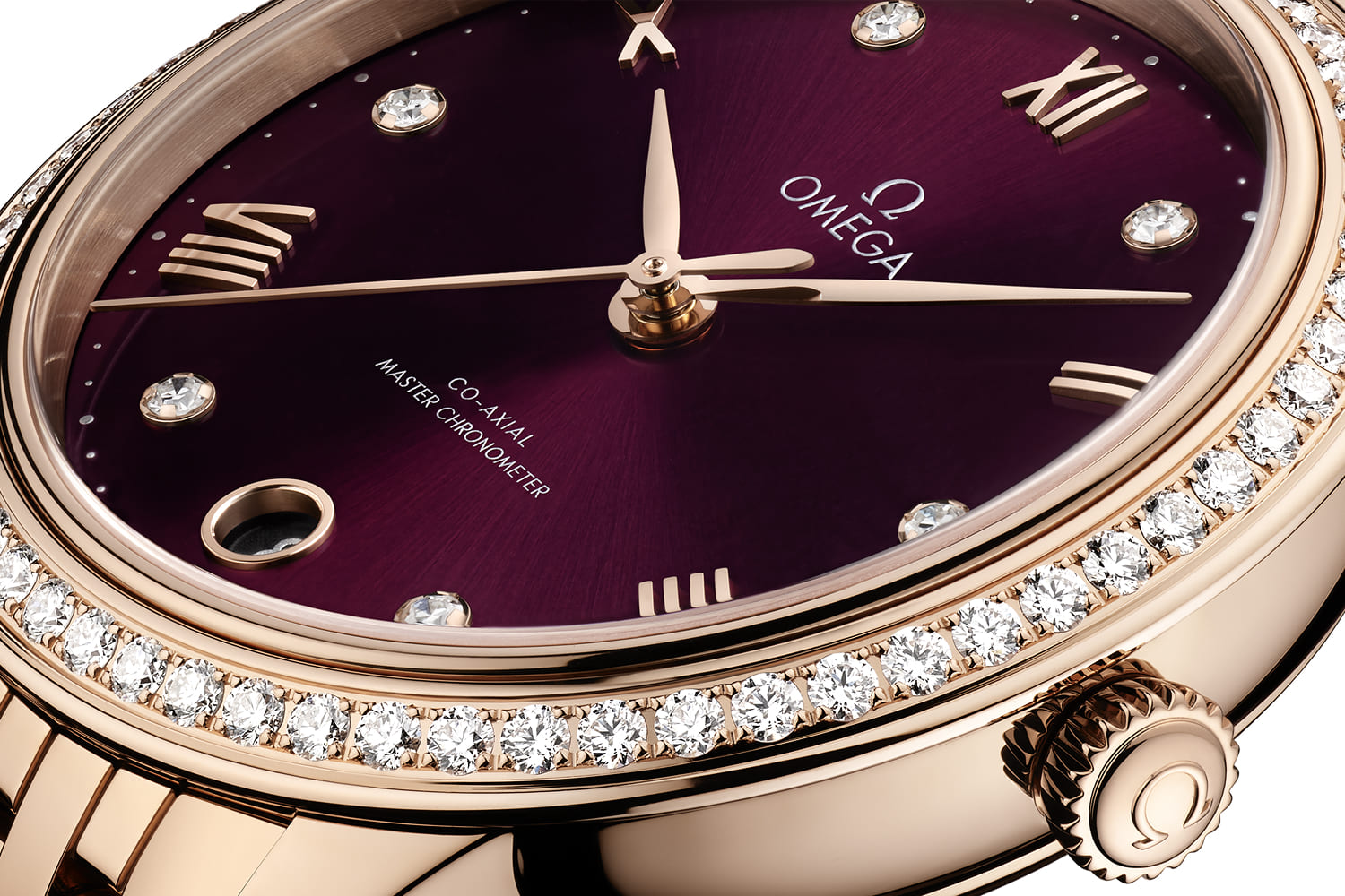 Entdecken Sie zeitlose Eleganz neu interpretiert mit der Omega De Ville Prestige aus Sedna-Gold mit dunkelrotem Zifferblatt.