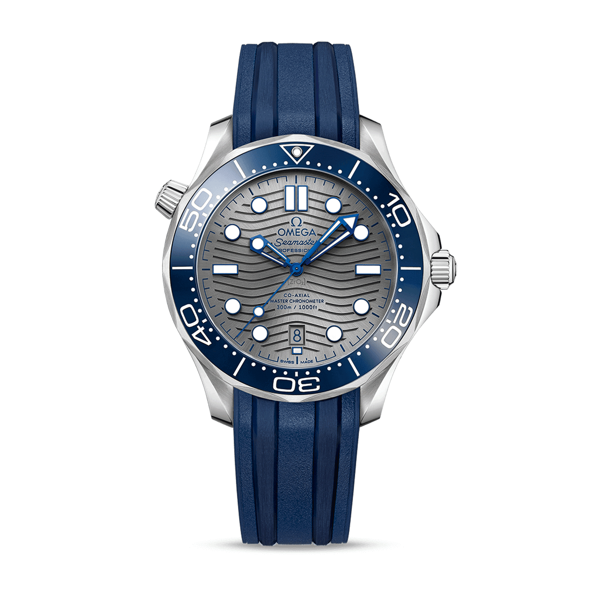 Die Omega Seamaster Diver-Linie hat hochpräzise Taucheruhren im Repertoire. Die Ausführung mit blauer Keramiklünette und Tauchskala aus weissem Email ist in einem 42-Millimeter-Gehäuse aus Edelstahl untergebracht. Die Armbanduhr verfügt über ein stimmiges Zifferblatt aus chromfarbener Keramik, das durch die PVD-Beschichtung und den Sonnenschliff eine einzigartige Optik erhält. Es bietet zudem eine Datumsindikation im Fenster und unterstützt den maritimen Ansatz optisch durch lasergravierte Wellen. Die sportliche Uhr wird an einem blauen Kautschukband getragen. Im Inneren schlägt ein Omega Master Chronometer Kaliber 8800, das durch den mit Saphirglas ausgestatteten Gehäuseboden bewundert werden kann. Die Uhr ist bis 30 bar (300 Meter) wasserdicht.