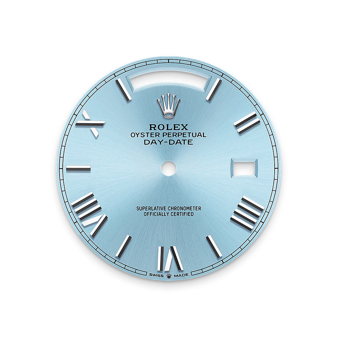 Das eisblaue Zifferblatt ist das dezente und exklusive Erkennungsmerkmal einer Rolex Armbanduhr in Platin. Rolex verwendet Platin, das edelste unter den Metallen, für die feinsten Armbanduhren. Diese exklusive Farbe des Zifferblatts ist nur bei der Day‑Date, dem Cosmograph Daytona und der Perpetual 1908 zu finden.