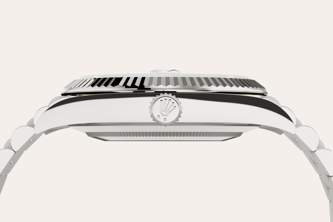 Die geriffelte Lünette von Rolex ist ein Markenzeichen. Ursprünglich hatte die Riffelung der Oyster Lünette einen praktischen Zweck: Sie diente zum Verschrauben mit dem Gehäuse, um die Wasserdichtheit der Armbanduhr zu gewährleisten. Die Riffelung entsprach deshalb der des Gehäusebodens, der ebenfalls mithilfe von Rolex Spezialwerkzeugen mit dem Gehäuse verschraubt wurde, um die Uhr wasserdicht zu machen. Mit der Zeit erhielt die Riffelung eine rein ästhetische Funktion und wurde zu einem prägenden Element des stilistischen Markenerbes von Rolex. Heute ist die geriffelte Lünette ein Distinktionsmerkmal, das bei dieser Day-Date 40 in Gold gefertigt wird.