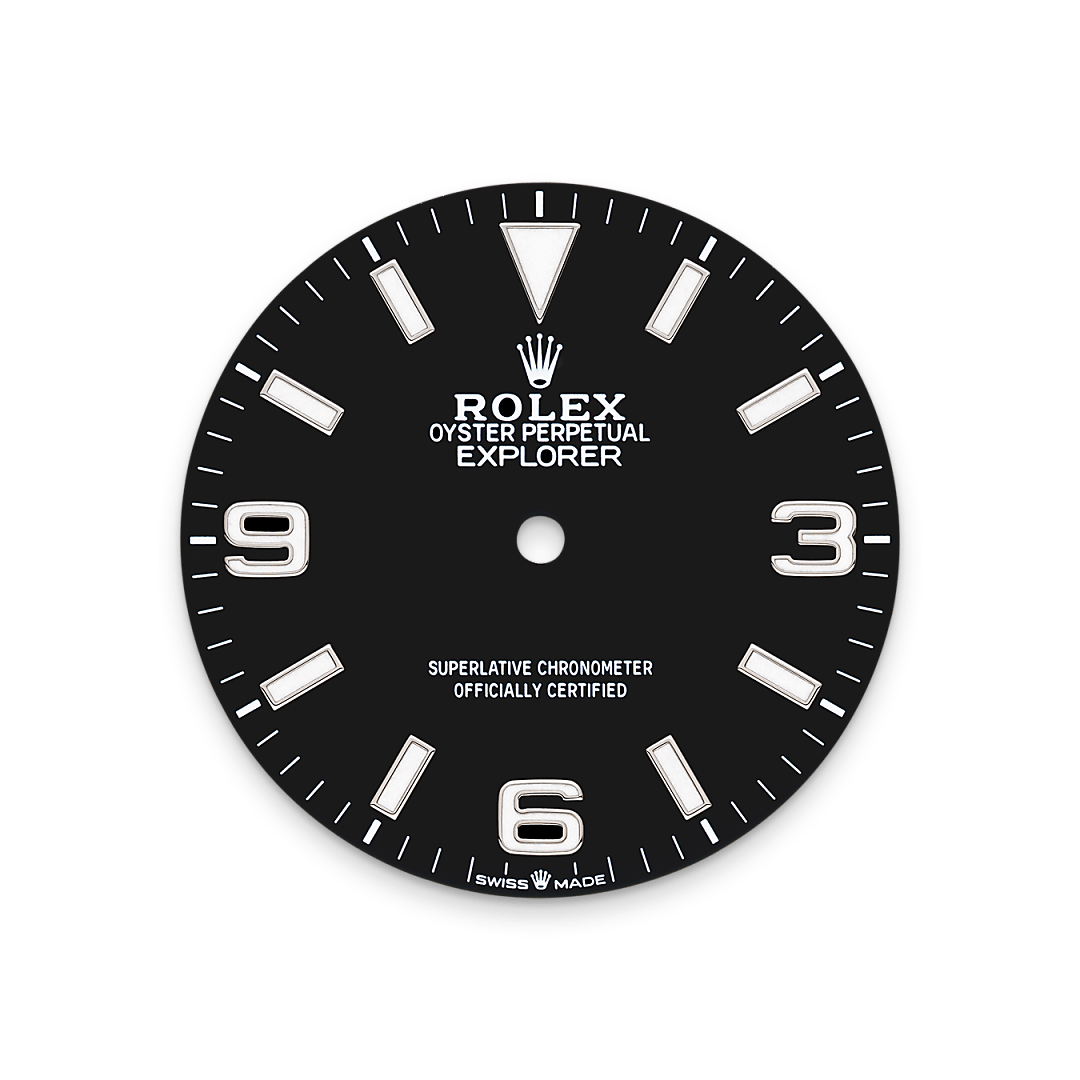 Das Zifferblatt verleiht einer Rolex Armbanduhr ein Gesicht sowie eine eigene Identität und sorgt überdies für perfekte Ablesbarkeit. Die charakteristischen Ziffern 3, 6 und 9 des Explorer Modells sind nun – ebenso wie seine Indizes und die Zeiger – mit einer blauen, sehr lange nachleuchtenden Leuchtmasse beschichtet. Wie jedes Rolex Zifferblatt wird auch das der Explorer 40 im eigenen Hause kreiert und fast vollständig in Handarbeit hergestellt, um seine Perfektion zu garantieren.