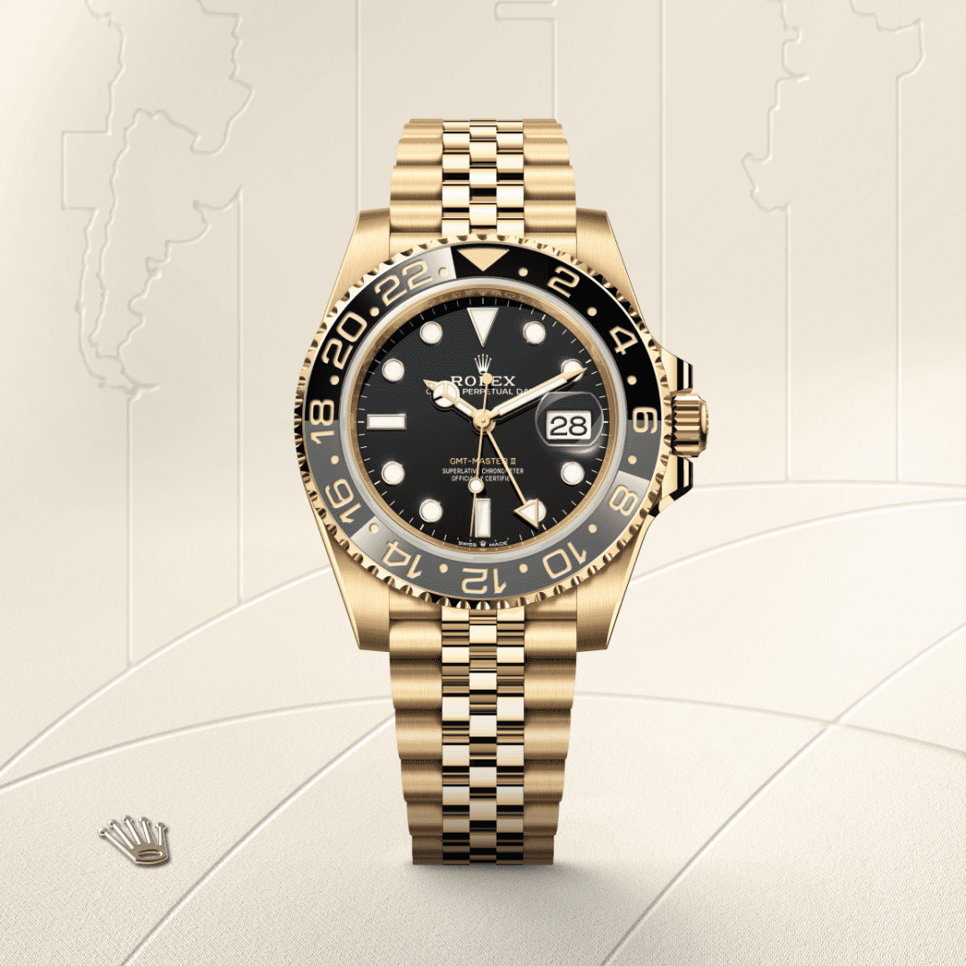 Dieses Modell verfügt über ein Zifferblatt in Schwarz und eine zweifarbige Cerachrom-Zahlenscheibe in grauer und schwarzer Keramik. In Ergänzung zu den traditionellen Stunden-, Minuten- und Sekundenzeigern besitzt die GMT‑Master II einen zusätzlichen Zeiger mit pfeilförmiger Spitze, der sich in 24 Stunden einmal um das Zifferblatt dreht, sowie eine in beide Richtungen drehbare Lünette mit 24-Stunden-Graduierung. Ein markant gefärbter 24-Stundenzeiger gibt die Referenzzeit an, die auf der Graduierung der Lünette abzulesen ist und die der Zeit in der ersten Zeitzone (zum Beispiel des Wohnorts) entspricht. Die Lokalzeit des Reisenden lässt sich in Einstundensprüngen leicht über einen raffinierten Mechanismus verstellen, der durch die Aufzugskrone zu bedienen ist. Der Stundenzeiger kann unabhängig vom Minuten- und Sekundenzeiger mit dem oder gegen den Uhrzeigersinn verstellt werden. Dies ermöglicht es den Reisenden, die neue Zeitzone einzustellen, ohne dass die Zeitangabe dabei an Präzision einbüßt.