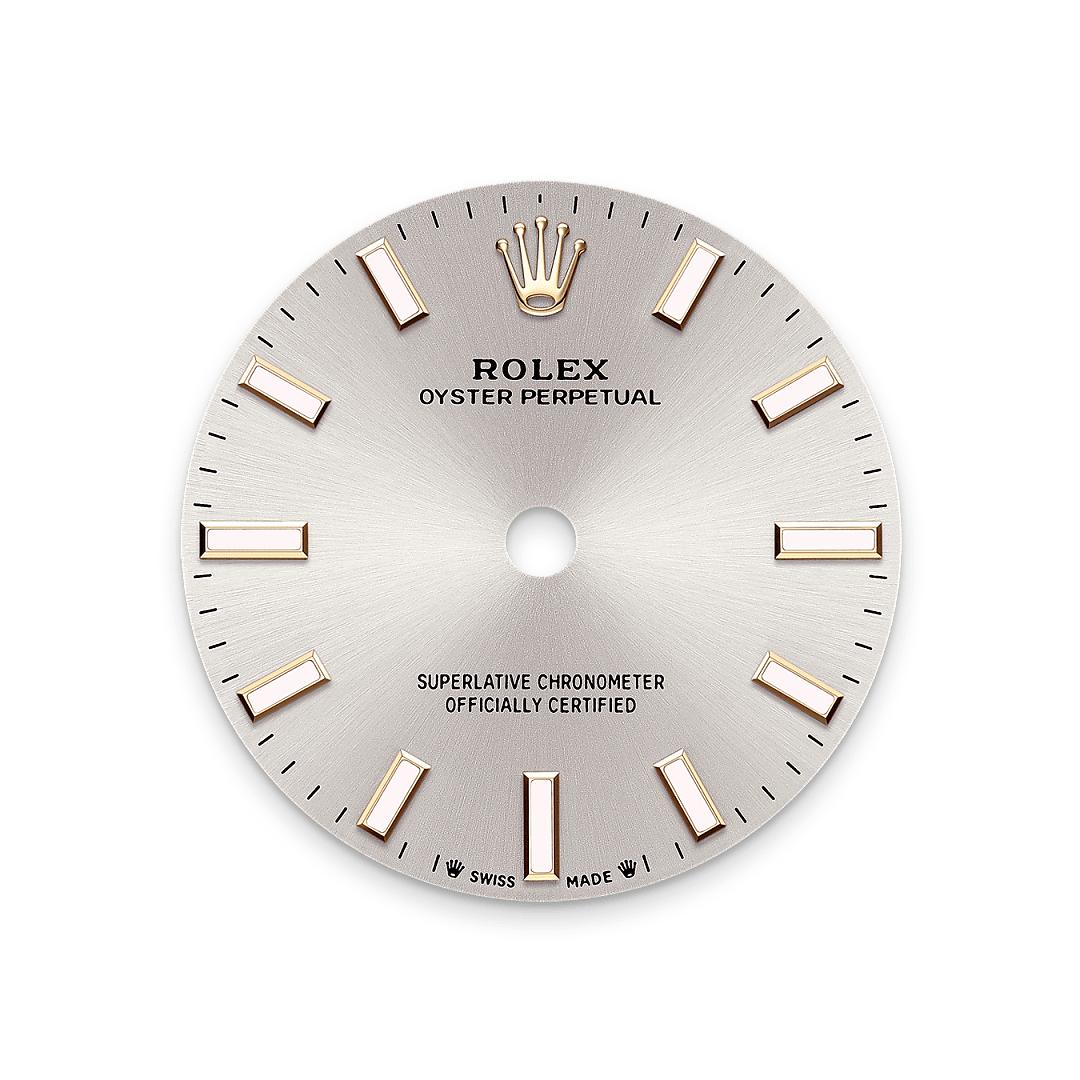Der Radialschliff lässt zarte Lichtreflexe auf vielen Zifferblättern der Oyster Perpetual Kollektion entstehen. Er umfasst virtuose Bürsttechniken, mit denen Riffelungen erzeugt werden, die von der Mitte des Zifferblatts her ausstrahlen. Licht fließt an jeder Einkerbung entlang und schafft damit einen charakteristischen subtilen Schimmer, der sich mit der Bewegung des Handgelenks verändert. Sobald der Radialschliff abgeschlossen ist, wird die Farbe anhand des PVD-Verfahrens (Physical Vapour Deposition, physikalische Gasphasenabscheidung) oder der Galvanoplastik auf das Zifferblatt aufgetragen. Eine dezente Lackierung verleiht dem Zifferblatt sein vollständiges Erscheinungsbild.