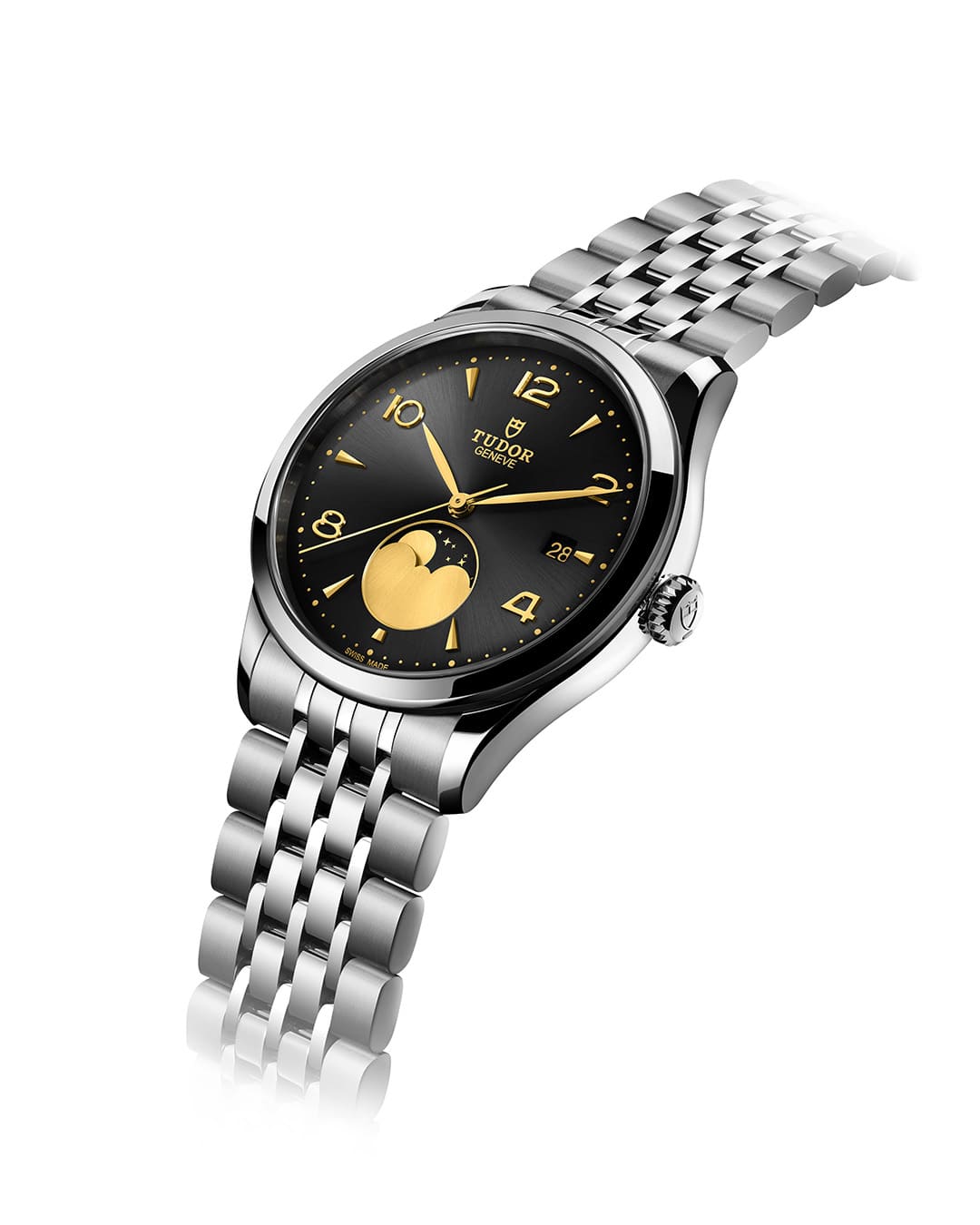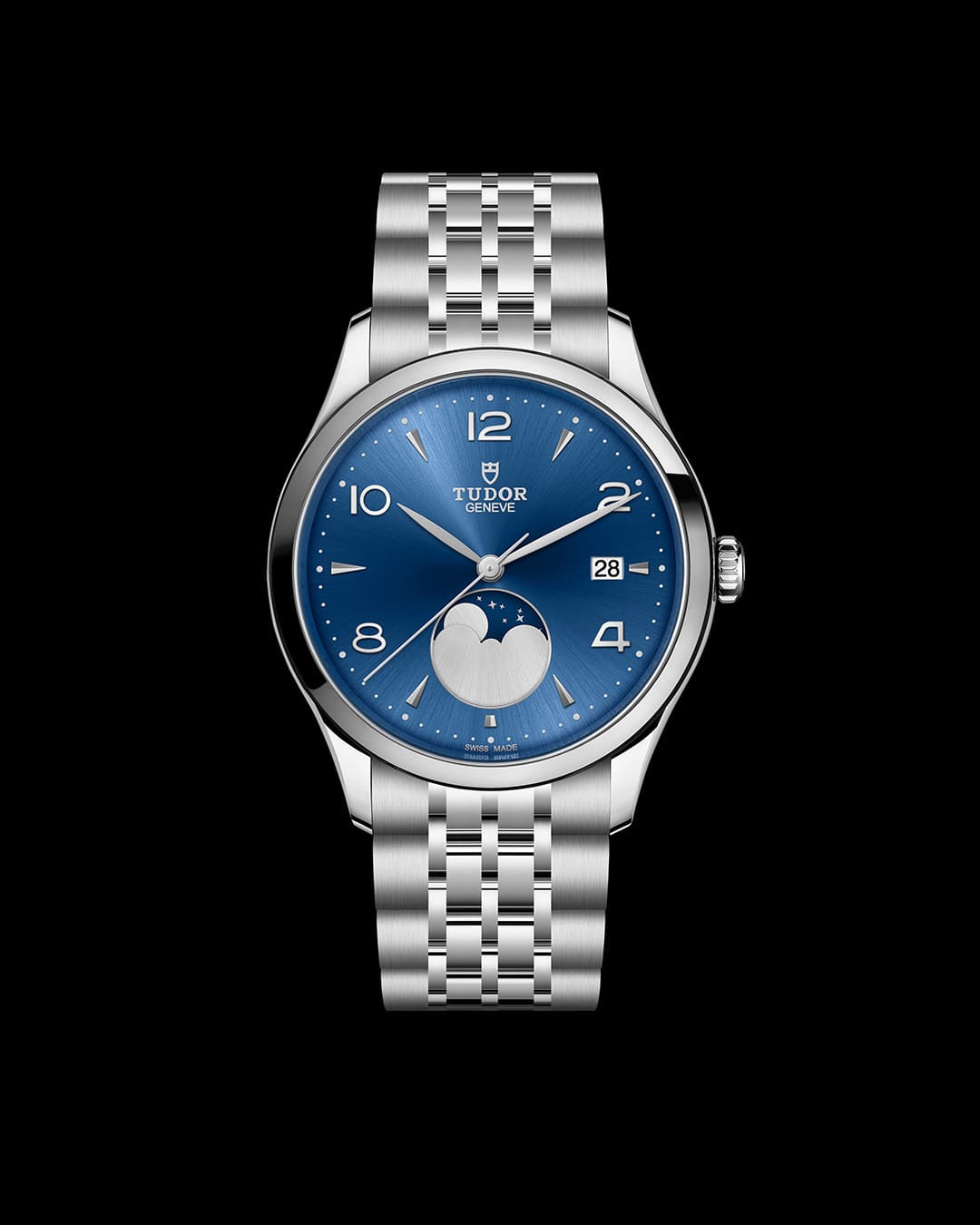 Im 39 mm grossen Gehäuse aus Edelstahl schlägt das neu entwickelte Kaliber TUDOR T607-9, ein Automatikuhrwerk mit 38 Stunden Gangreserve und präziser Mondphasenanzeige, die sich über einen seitlichen Drücker fein justieren lässt. Trotz der Komplikation bleibt die Uhr mit 10,1 mm Bauhöhe angenehm flach am Handgelenk. Die gewölbte Saphirglasscheibe, das siebenreihige Edelstahlband mit polierten Mittelelementen sowie eine glatte Lünette unterstreichen den hochwertigen Anspruch dieses Zeitmessers.