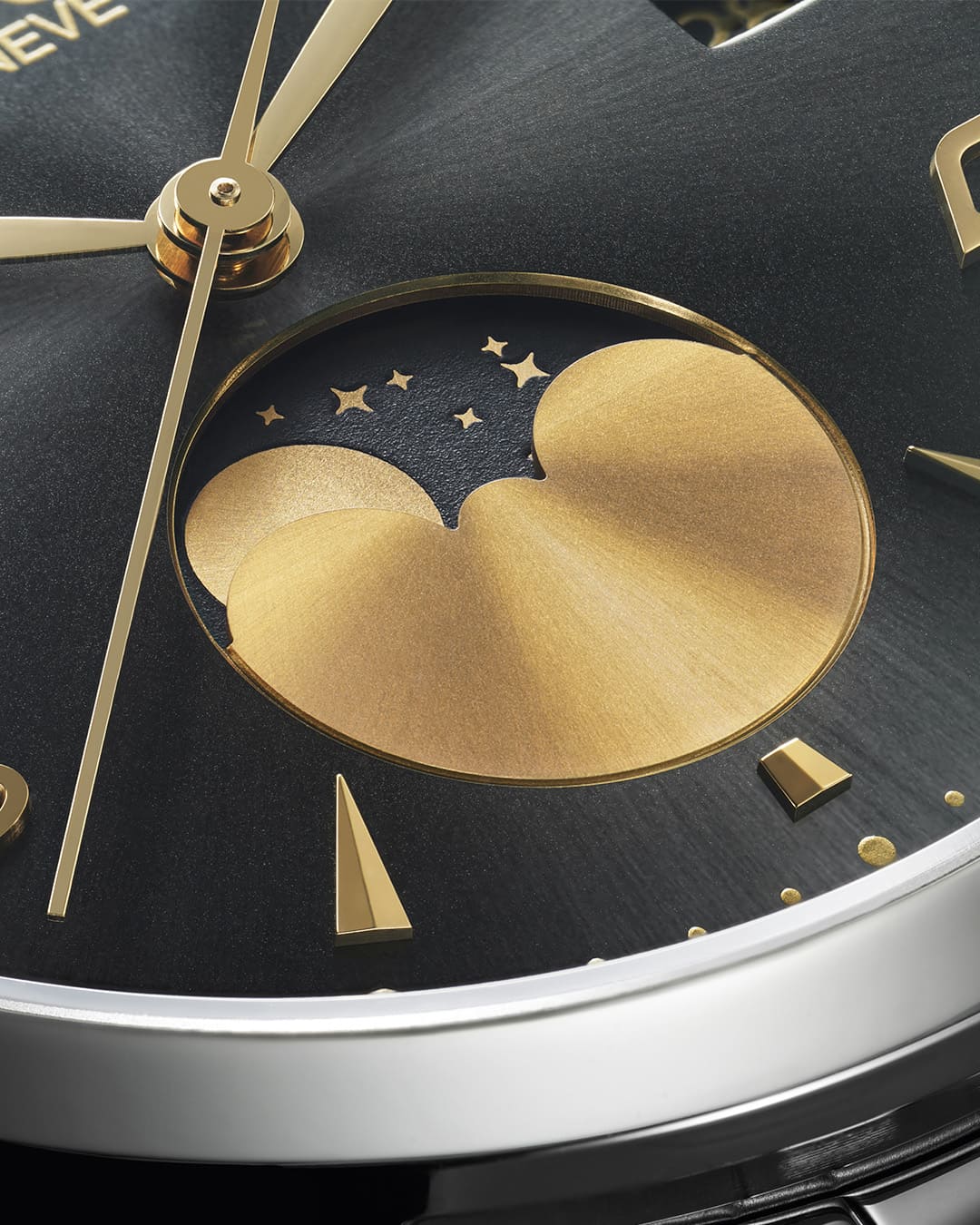 Die 1926 Luna ist in drei Varianten erhältlich: mit schwarzem, blauem oder champagnerfarbenem Zifferblatt, jeweils mit feinem Sonnenschliff und applizierten arabischen Ziffern auf den geraden Stunden sowie pfeilförmigen Indizes auf den ungeraden Positionen. Bei 6 Uhr liegt die sorgfältig gestaltete Mondphasenanzeige, die je nach Zifferblattfarbe unterschiedlich inszeniert ist. Besonders eindrucksvoll: Beim champagnerfarbenen Modell schiebt sich ein goldener Mond hinter eine schwarze «Wolke» und enthüllt sich im Rhythmus des Mondzyklus.